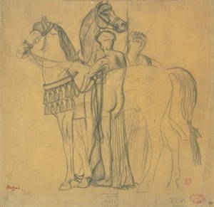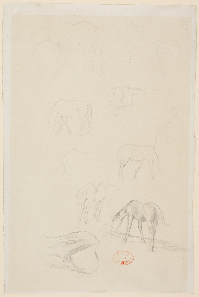 The digital catalogue raisonné of the 1506 drawings by Degas that we are publishing naturally complements the one of the 1759 paintings and pastels already online. Never undertaken before, this catalogue raisonné enhances our knowledge of an artist for whom drawing was a major art form. Isn't his passion for Ingres proof of this? Through the variety of subjects and techniques, Degas gives drawing an essential place in his art, often at the basis of his projects and their evolution. Like the digital catalogue raisonné of paintings and pastels, the one for drawings is regularly expanded and updated. It includes all the subjects he treats in his paintings and pastels. More than 1200 drawings were found in his studio in December 1917 and were inventoried. They were then published and reproduced in the four catalogues of the posthumous sales of 1918-1919. Generally unsigned, they were stamped after these sales. This leads us to believe that Degas did not trade them, as his paintings and pastels were more sought after at the time. Our estimates are currently based on the inventories (Succession Degas, Nepveu-Degas) and on the four posthumous sales. During the sales, drawings were sold in lots, not described and not reproduced, which complicates any estimation, especially since the same stamps from the posthumous sales were also affixed to these separately sold drawings.