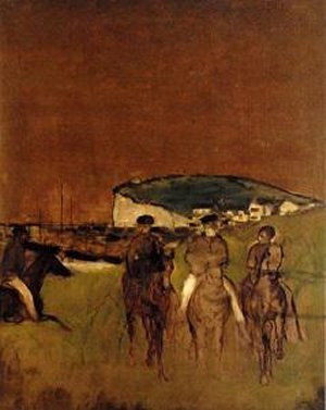Pastels are the most famous and representative works of Degas' art. Among Degas' numerous pastels, we have chosen this Woman Before a Mirror - Hamburger Kunsthalle (Hamburg) - reproduced on the home page. Here, Degas has chosen elegant and harmonious colors showing his perfect mastery of technique: like At the Milliner's from the Thyssen-Bornemisza Museum – Madrid - and his Singer in Green from the Metropolitan Museum of Art, New York. In some, he plays with a dominant color, with green in his Large Dancers, with blue in his Two Dancers at Rest and with pink in his Dancers from the Fitzwilliam Museum, Cambridge. For his pastels, Degas can use various supports: paper, panel, cardboard and even canvas as for his Seated Dancers. He also turns to other subjects such as bathers illustrated by this pastel Bathers from the National Gallery, Washington and horse racing like Before the Race from the Cleveland Museum of Art.