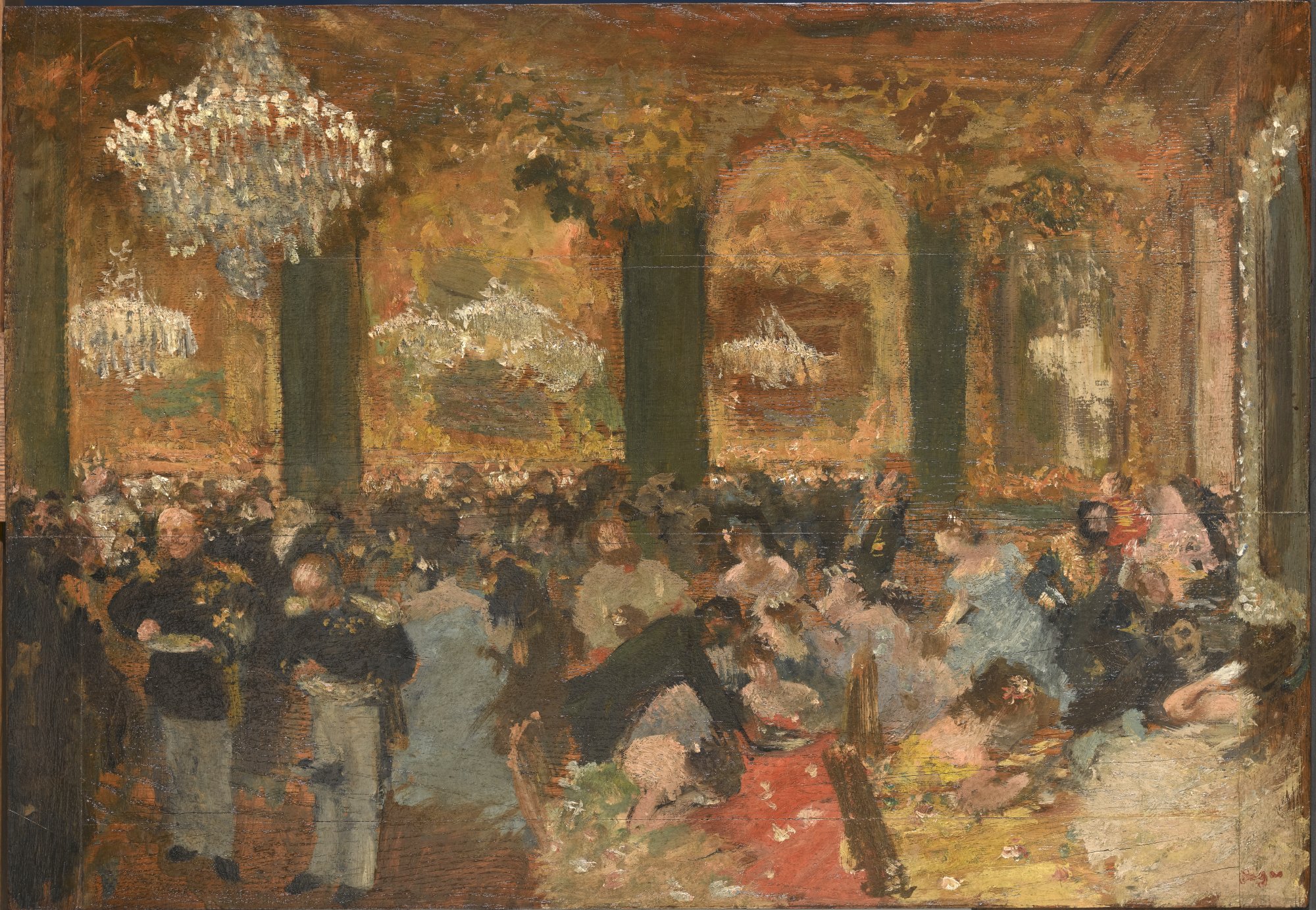 Les peintures présentent une autre facette de l'art de Degas. Il y traite certains sujets qu'on ne retrouve pas dans ses pastels touchant par exemple à la musique et l'Opéra comme Le père de Degas écoutant Pagans du Boston Museum of Fine Arts.