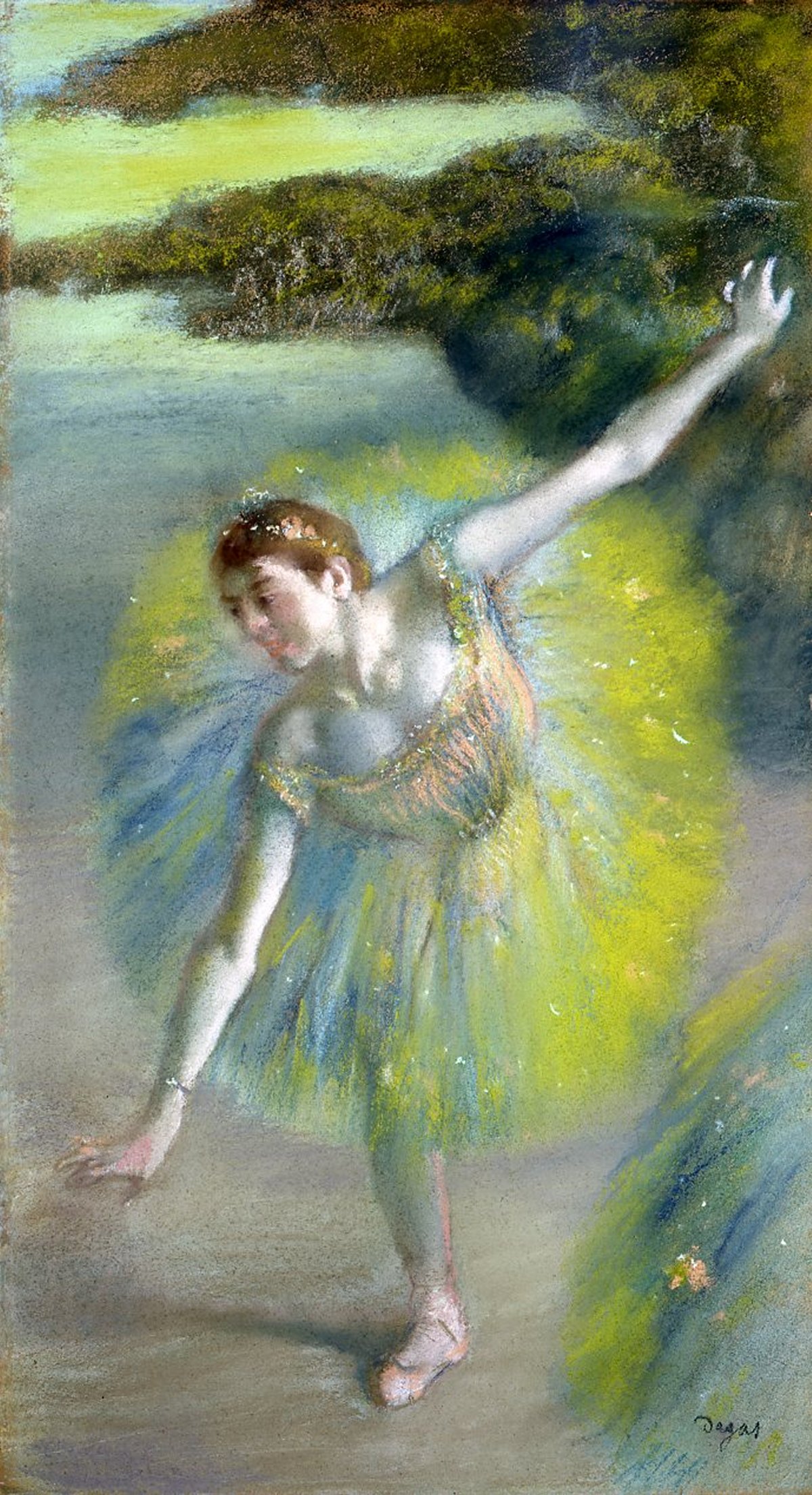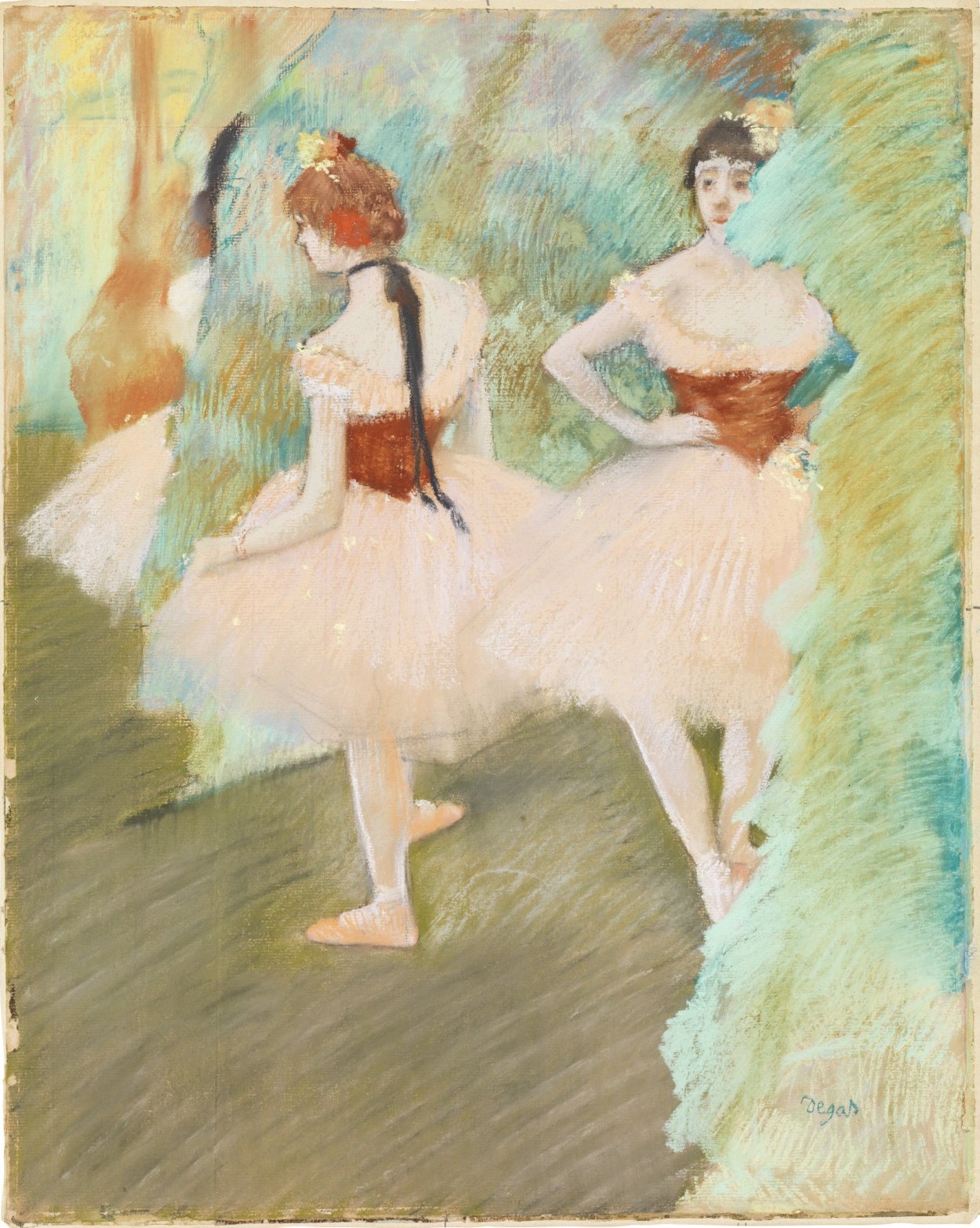 Les pastels sont les œuvres les plus connues et les plus représentatives de l'art de Degas. Parmi les nombreux pastels de Degas, nous avons choisi cette Femme au miroir - Hamburger Kunsthalle (Hambourg) - reproduite en page d'accueil. Ici, Degas a choisi d'élégantes et harmonieuses couleurs montrant qu'il maîtrise parfaitement sa technique : comme Chez la modiste du musée Thyssen-Bornemizsa – Madrid - et sa Chanteuse en vert du Metropolitan Museum of Art, New York. Dans certains, il joue avec une couleur dominante, avec le vert dans ses Grandes danseuses, avec le bleu dans ses Deux danseuses au repos et avec le rose dans ses Danseuses du Fitzwilliam Museum, Cambridge. Pour ses pastels, Degas peut utiliser des supports variés : papier, panneau, carton et même toile comme pour ses Danseuses assises. Il se tourne aussi vers d'autres sujets tels que les baigneuses qu'illustre ce pastel Baigneuses de la National Gallery, Washington et les courses de chevaux comme Avant la course du Cleveland Museum of Art.
