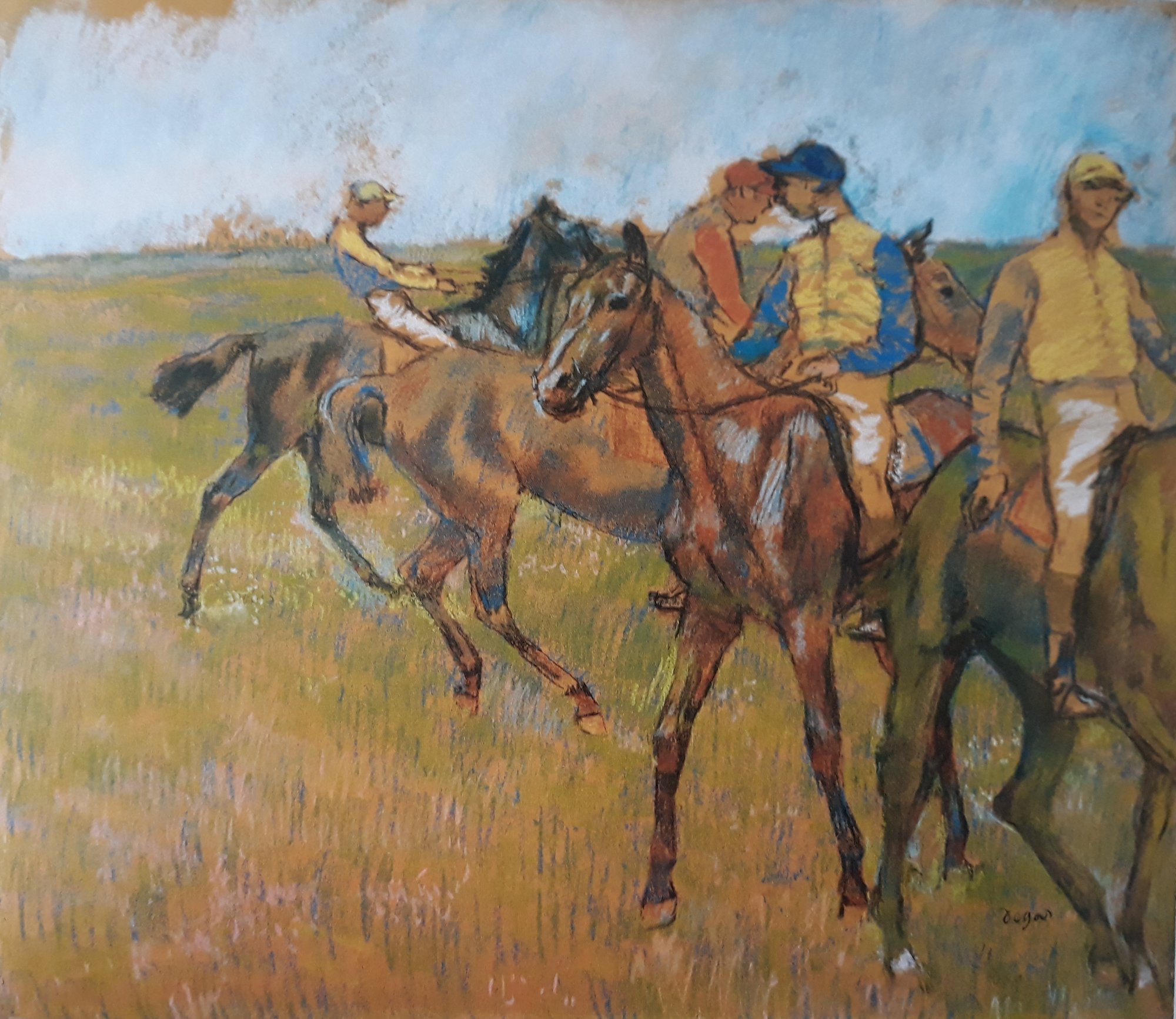 Les pastels sont les œuvres les plus connues et les plus représentatives de l'art de Degas. Parmi les nombreux pastels de Degas, nous avons choisi cette Femme au miroir - Hamburger Kunsthalle (Hambourg) - reproduite en page d'accueil. Ici, Degas a choisi d'élégantes et harmonieuses couleurs montrant qu'il maîtrise parfaitement sa technique : comme Chez la modiste du musée Thyssen-Bornemizsa – Madrid - et sa Chanteuse en vert du Metropolitan Museum of Art, New York. Dans certains, il joue avec une couleur dominante, avec le vert dans ses Grandes danseuses, avec le bleu dans ses Deux danseuses au repos et avec le rose dans ses Danseuses du Fitzwilliam Museum, Cambridge. Pour ses pastels, Degas peut utiliser des supports variés : papier, panneau, carton et même toile comme pour ses Danseuses assises. Il se tourne aussi vers d'autres sujets tels que les baigneuses qu'illustre ce pastel Baigneuses de la National Gallery, Washington et les courses de chevaux comme Avant la course du Cleveland Museum of Art.