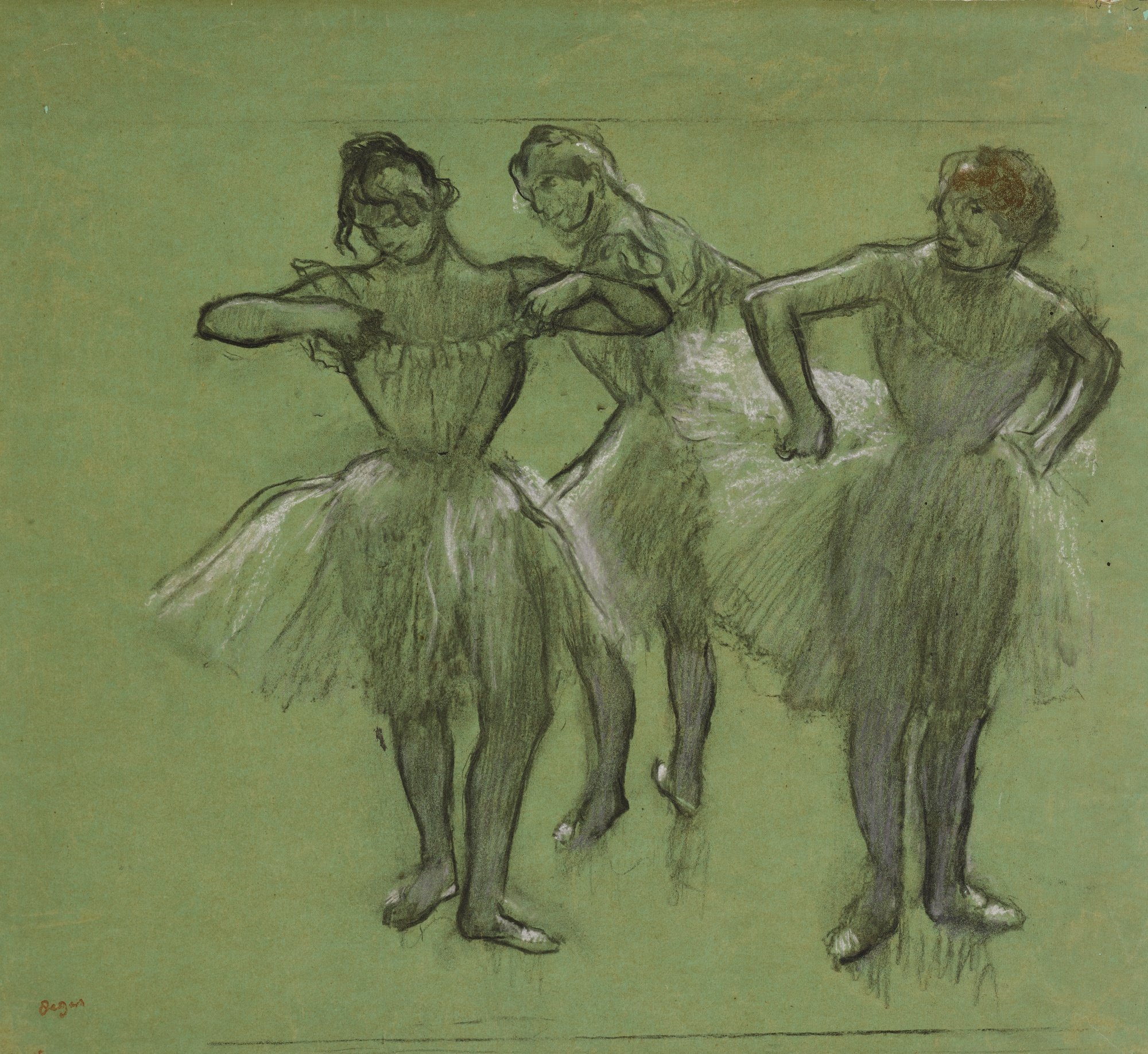 Les pastels sont les œuvres les plus connues et les plus représentatives de l'art de Degas. Parmi les nombreux pastels de Degas, nous avons choisi cette Femme au miroir - Hamburger Kunsthalle (Hambourg) - reproduite en page d'accueil. Ici, Degas a choisi d'élégantes et harmonieuses couleurs montrant qu'il maîtrise parfaitement sa technique : comme Chez la modiste du musée Thyssen-Bornemizsa – Madrid - et sa Chanteuse en vert du Metropolitan Museum of Art, New York. Dans certains, il joue avec une couleur dominante, avec le vert dans ses Grandes danseuses, avec le bleu dans ses Deux danseuses au repos et avec le rose dans ses Danseuses du Fitzwilliam Museum, Cambridge. Pour ses pastels, Degas peut utiliser des supports variés : papier, panneau, carton et même toile comme pour ses Danseuses assises. Il se tourne aussi vers d'autres sujets tels que les baigneuses qu'illustre ce pastel Baigneuses de la National Gallery, Washington et les courses de chevaux comme Avant la course du Cleveland Museum of Art.